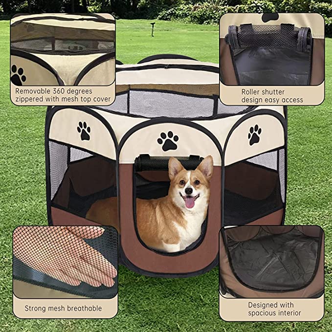 Conveniente:No requiere ensamblaje, se instala en segundos y no requiere ensamblaje; se pliega cuando no está en uso para facilitar su transporte y almacenamiento. parque para mascotas plegable, liviano pero resistente, se puede usar en interiores o al aire libre, para acampar.